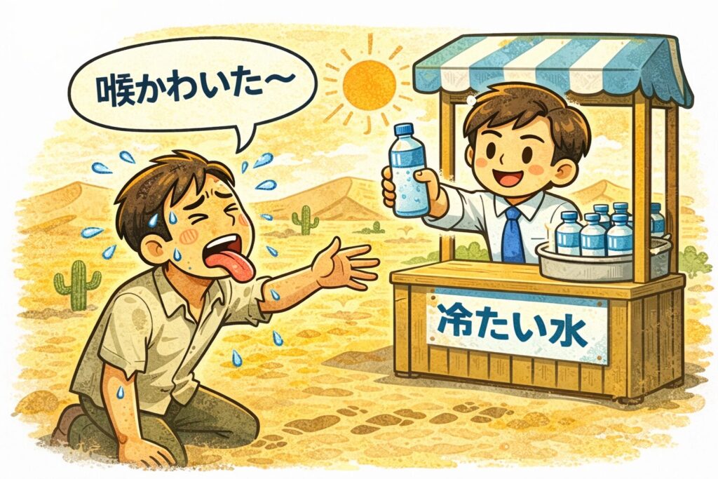 下の画像のように、砂漠で500mlの水を販売すると売れることは想像しやすいと思います。