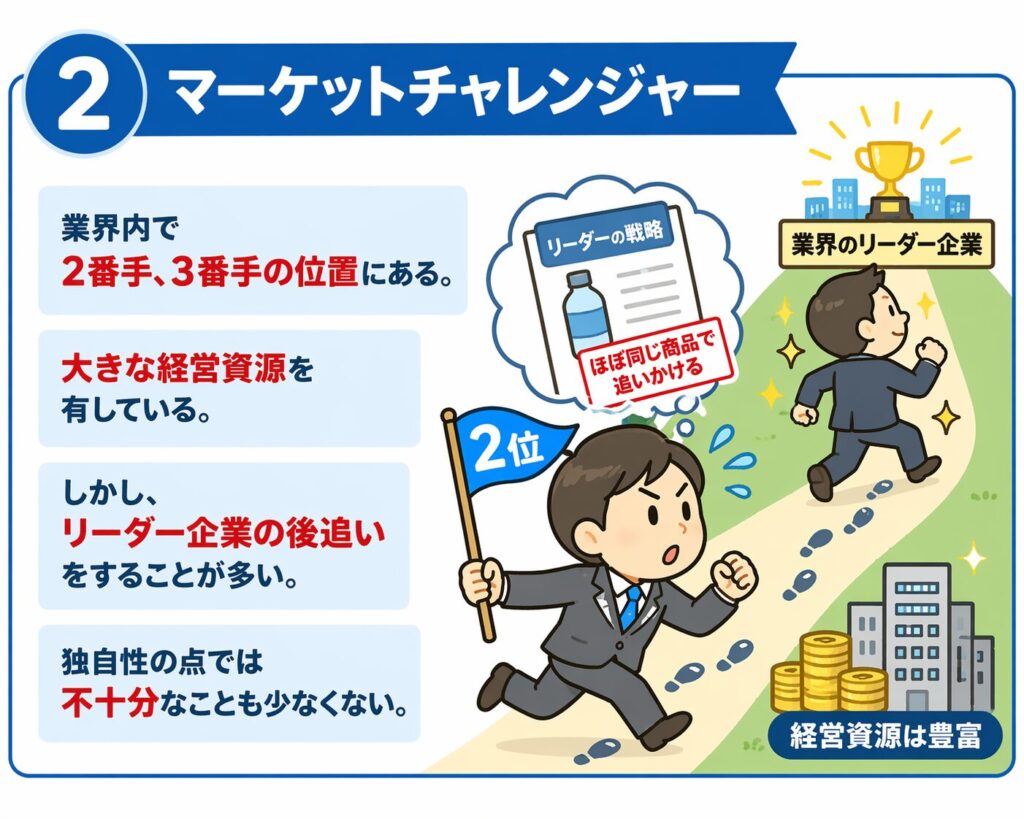 業界内で2番手、3番手の位置にあり、大きな経営資源を有してもいます。しかしリーダー企業の後追いをすることが多く、独自性の点では不十分なことも少なくありません。